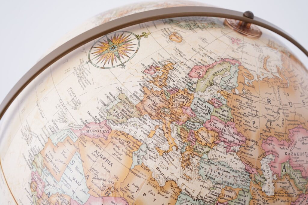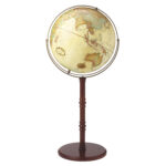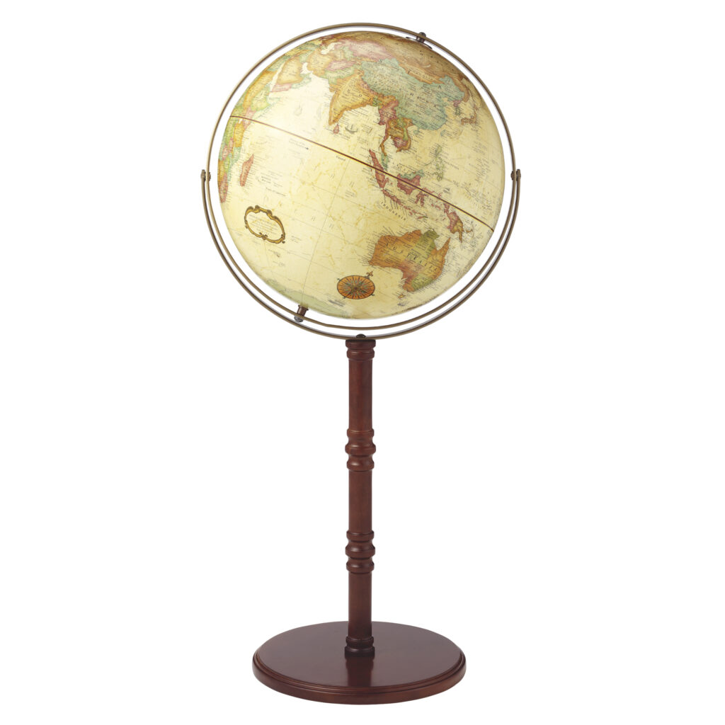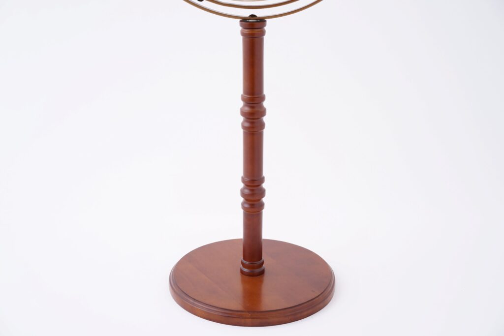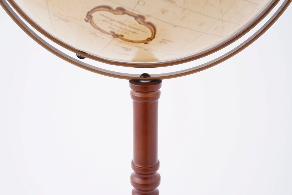 丁寧にろくろ加工された木製の支柱と台座に載ったアンティーク調の地球儀がお部屋の雰囲気を一段と高めます。金属製全円子午環は南北にも転回するジャイロマティックですから、南半球も容易にご覧頂けます。